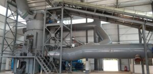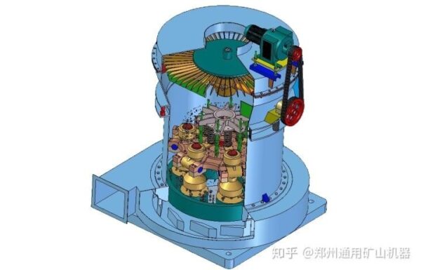 The grinding roller rolls tightly against the grinding ring under the action of centrifugal force. The scraper scoops up the material and sends it to the middle of the grinding roller and grinding ring. The material is crushed into powder under the action of the grinding pressure. Then, the fan blows the powdered material up and passes it through the analyzer. The material that meets the fineness requirement passes through the analyzer, and the material that does not meet the requirement returns to the grinding chamber for further grinding. The material that passes the analyzer is separated and collected in the cyclone separator. The exhaust air is isolated by industrial filter cloth and the exhaust is pulverized once.